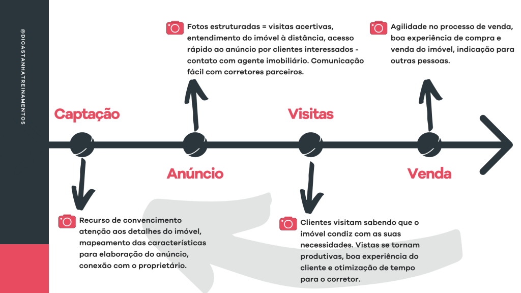 Porém não é somente no momento do anúncio que as fotografias serão utilizadas como recurso, mas em todo o processo da transação. É isso mesmo! As fotos auxiliam desde a captação do imóvel até a concretização da sua venda, como apresentado no esquema abaixo: